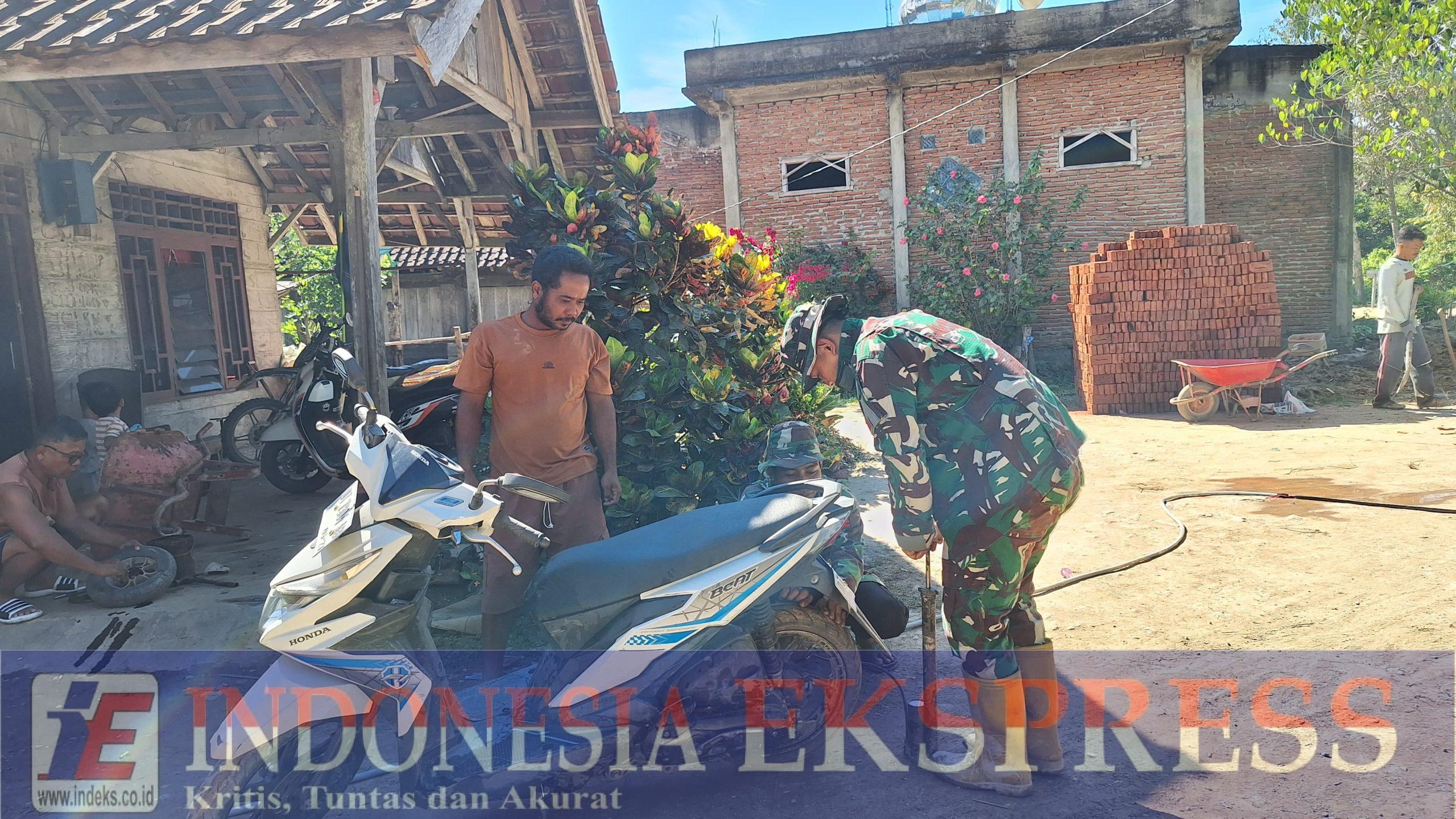 Seperti yang dilakukan Praka Praka Ronji dan anggota satgas TMMD lainnya membantu pompa ban sepeda motor milik bapak Iswar (39) karena kurang angin.