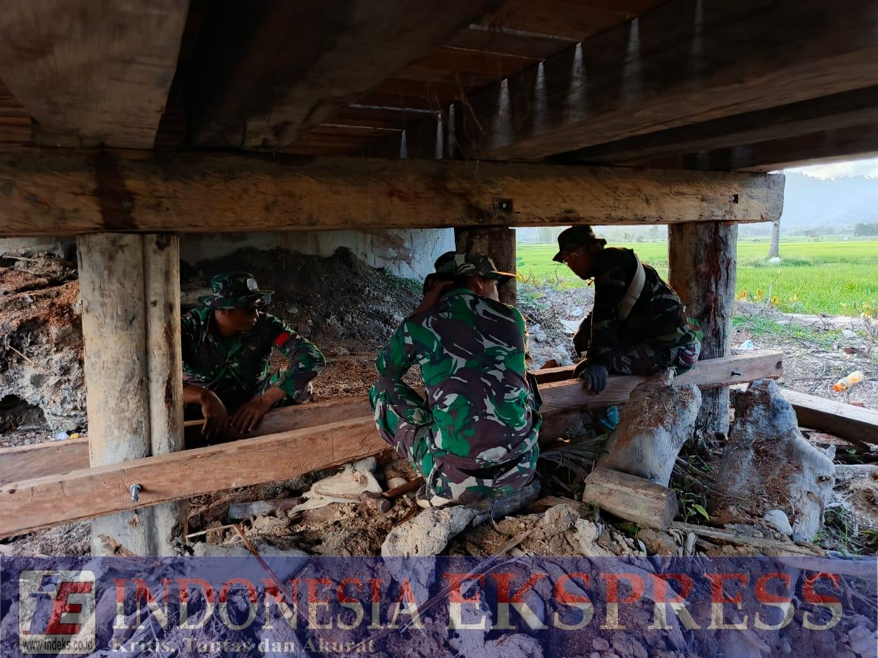 Guna memastikan ketahanan dan keamanan jembatan, anggota Satgas TMMD melakukan penguatan struktur dengan metode mengkancing tiang jembatan menggunakan balok kayu keras dan baut panjang. Teknik ini dinilai efektif untuk memperkokoh fondasi dan menopang beban kendaraan berat secara berkelanjutan.