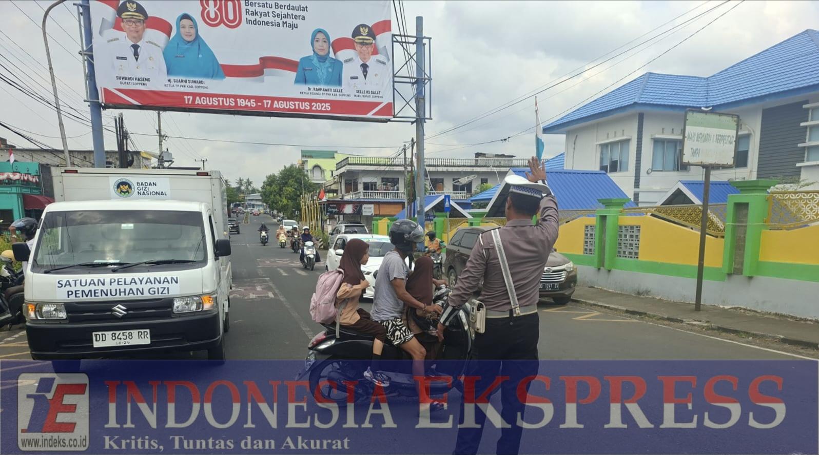 Soppeng, INDEKS.co.id – Dua anggota Unit Pengaturan, Penjagaan, Pengawalan, dan Patroli (Turjawali) Satuan Lalu Lintas (Sat Lantas) Polres Soppeng sigap mengatur arus lalu lintas di Jalan Kemakmuran, tepatnya di depan SDN 3 Lemba, Kecamatan Lalabata, Kota Watansoppeng, Sulawesi Selatan, Jumat (8/8/2025).