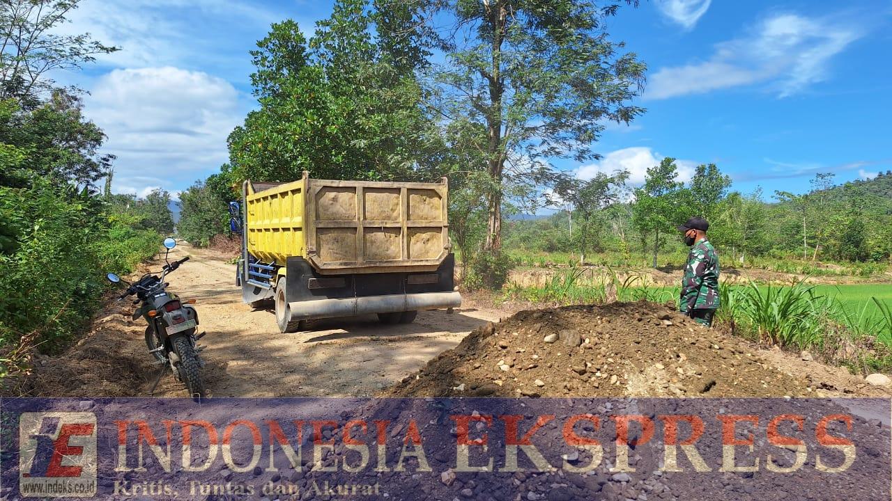 Di bawah teriknya matahari, anggota Satgas TMMD bersama warga bahu-membahu melakukan penimbunan, perataan, hingga pengerasan badan jalan di Desa Nekudu. Proses tersebut sudah mencapai progres signifikan.