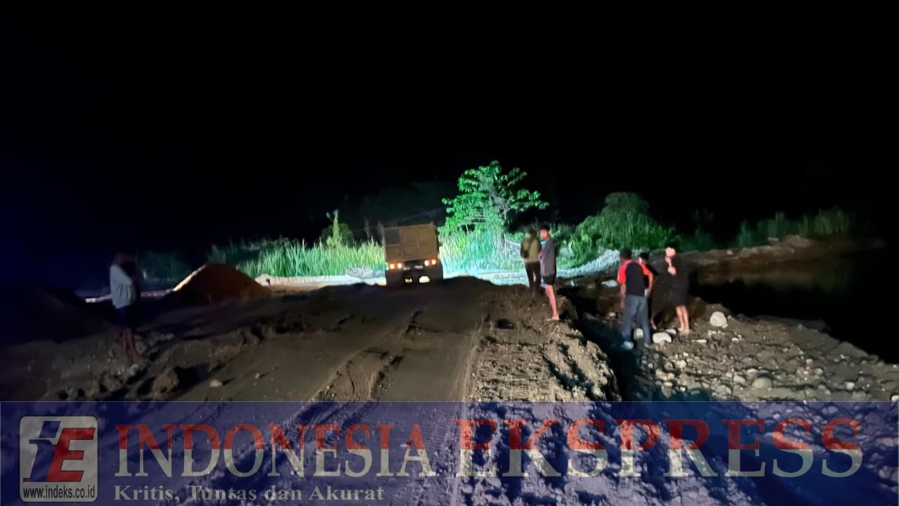 Pantauan di lapangan, sejumlah dump truk hilir-mudik membawa material untuk kemudian ditimbun di badan jalan. Sementara itu, alat grader terus bekerja meratakan timbunan agar akses jalan segera dapat digunakan warga.