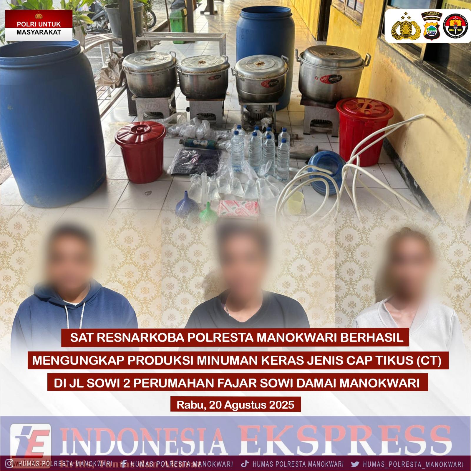 Manokwari, INDEKS.co.id – Satuan Reserse Narkoba (Satresnarkoba) Polresta Manokwari berhasil mengungkap praktik produksi minuman keras lokal jenis Cap Tikus (CT) di kawasan Jalan Sowi Dua, Perumahan Fajar Sowi Damai, Distrik Manokwari Selatan, Selasa (19/8/2025).