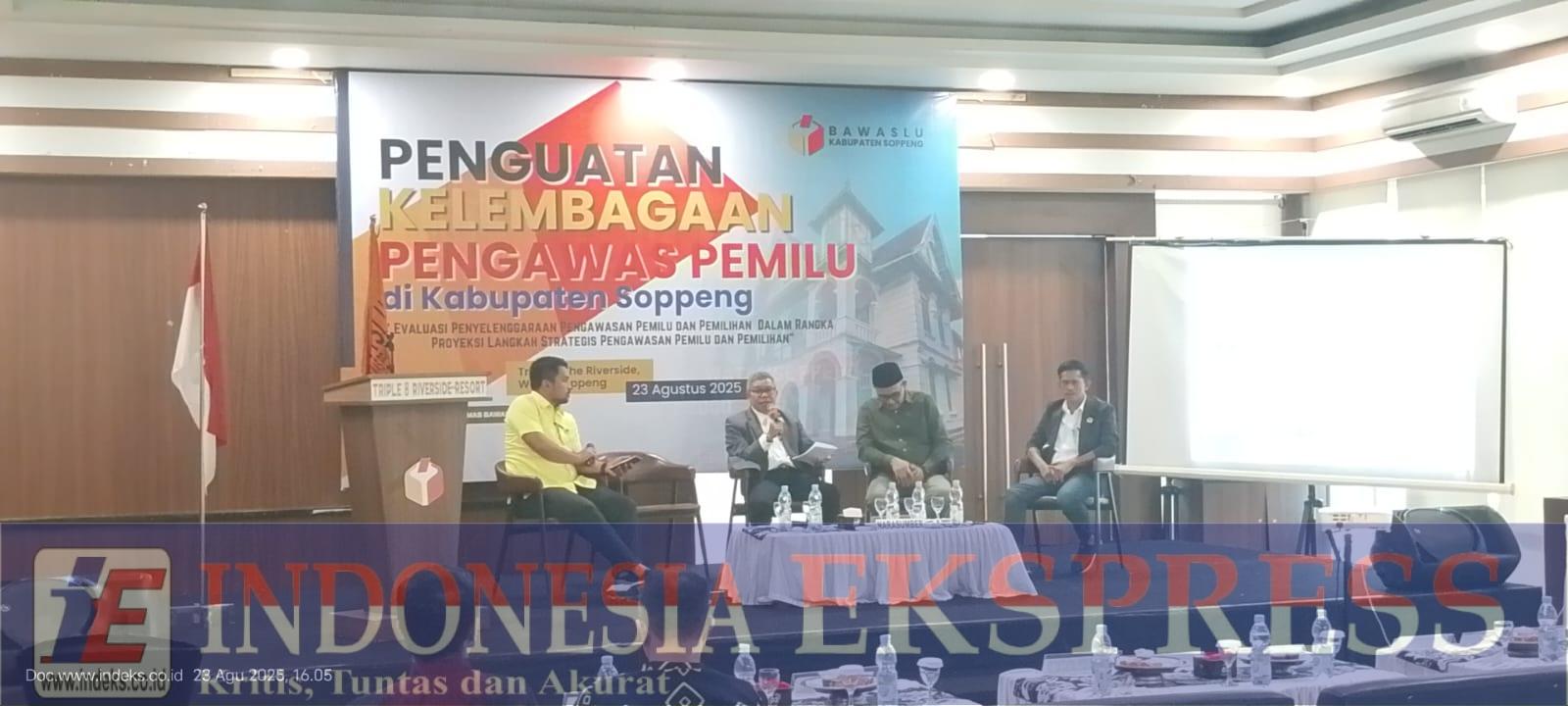 SOPPENG, INDEKS.co.id – Badan Pengawas Pemilu (Bawaslu) Kabupaten Soppeng menggelar kegiatan Penguatan Kelembagaan Pengawasan Pemilu dengan tema “Evaluasi Penyelenggaraan Pengawasan Pemilu dan Pemilihan, serta Proyeksi Strategis Pengawasan”. Acara ini berlangsung di Triple 8 The Riverside, Watansoppeng, Sabtu (23/8/2025).