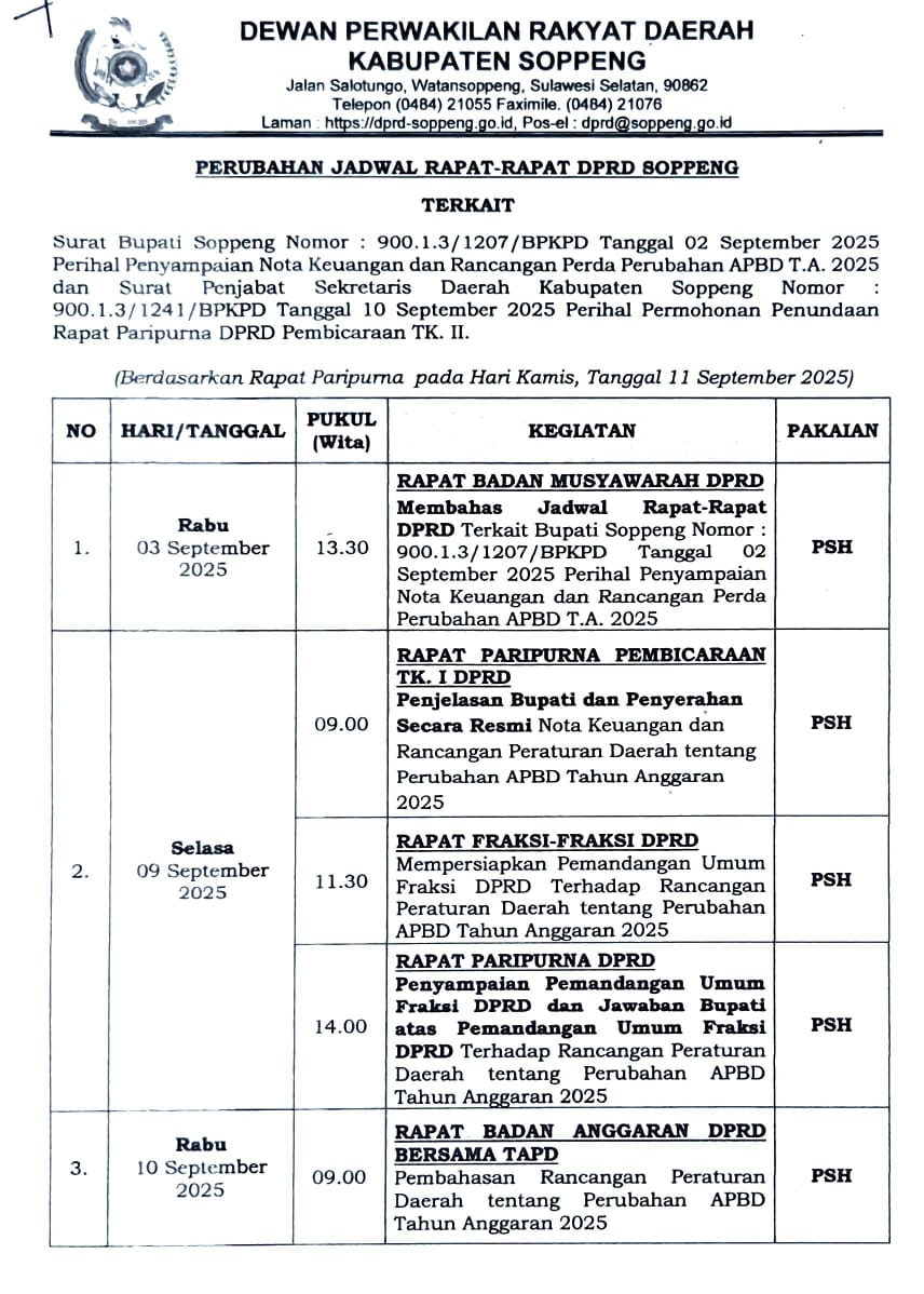 SOPPENG, INDEKS.CO.ID – Dewan Perwakilan Rakyat Daerah (DPRD) Kabupaten Soppeng akan menggelar rapat paripurna pembahasan dan penetapan Anggaran Pendapatan dan Belanja Daerah (APBD) Perubahan Tahun Anggaran 2025 pada Jumat, 19 September 2025.