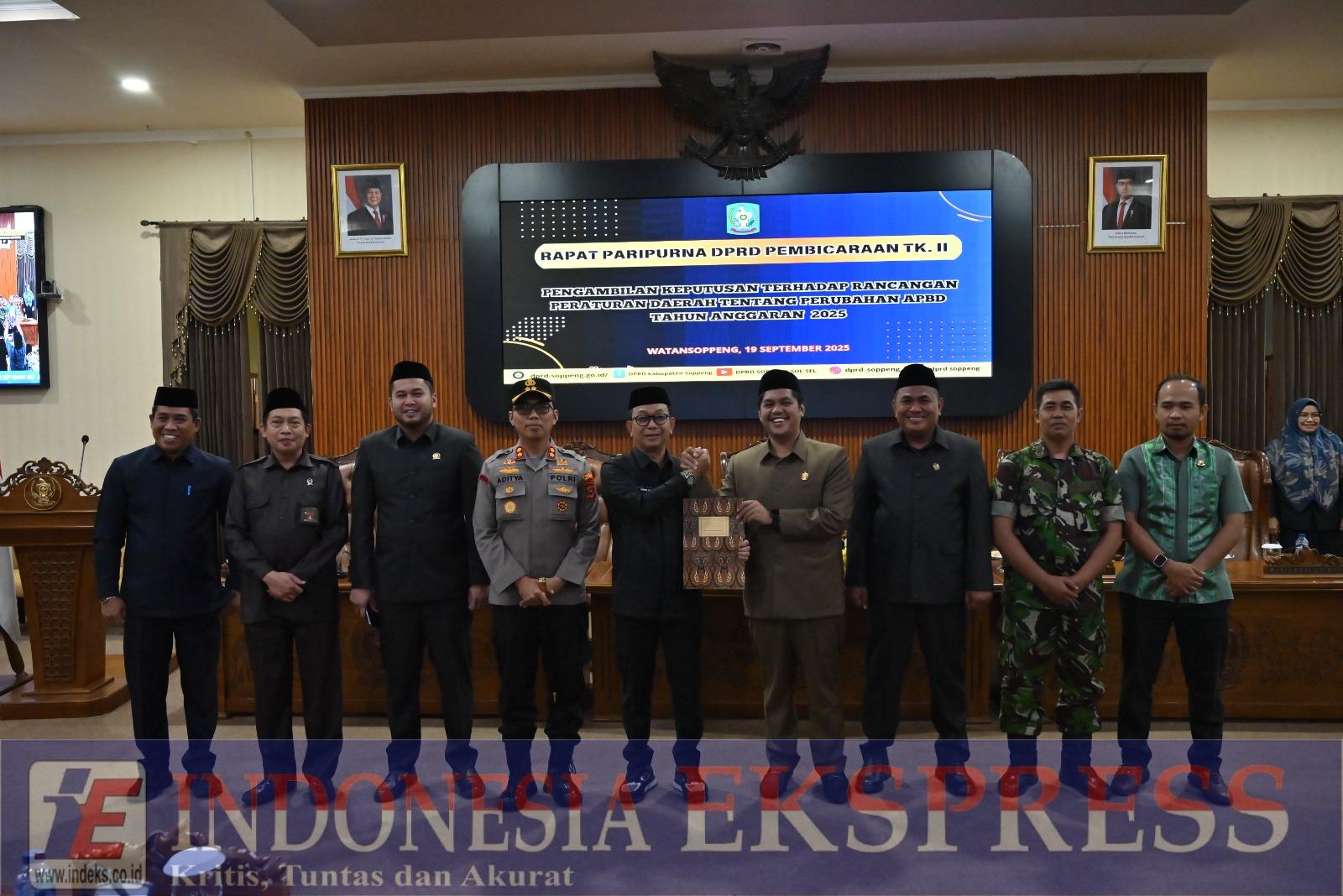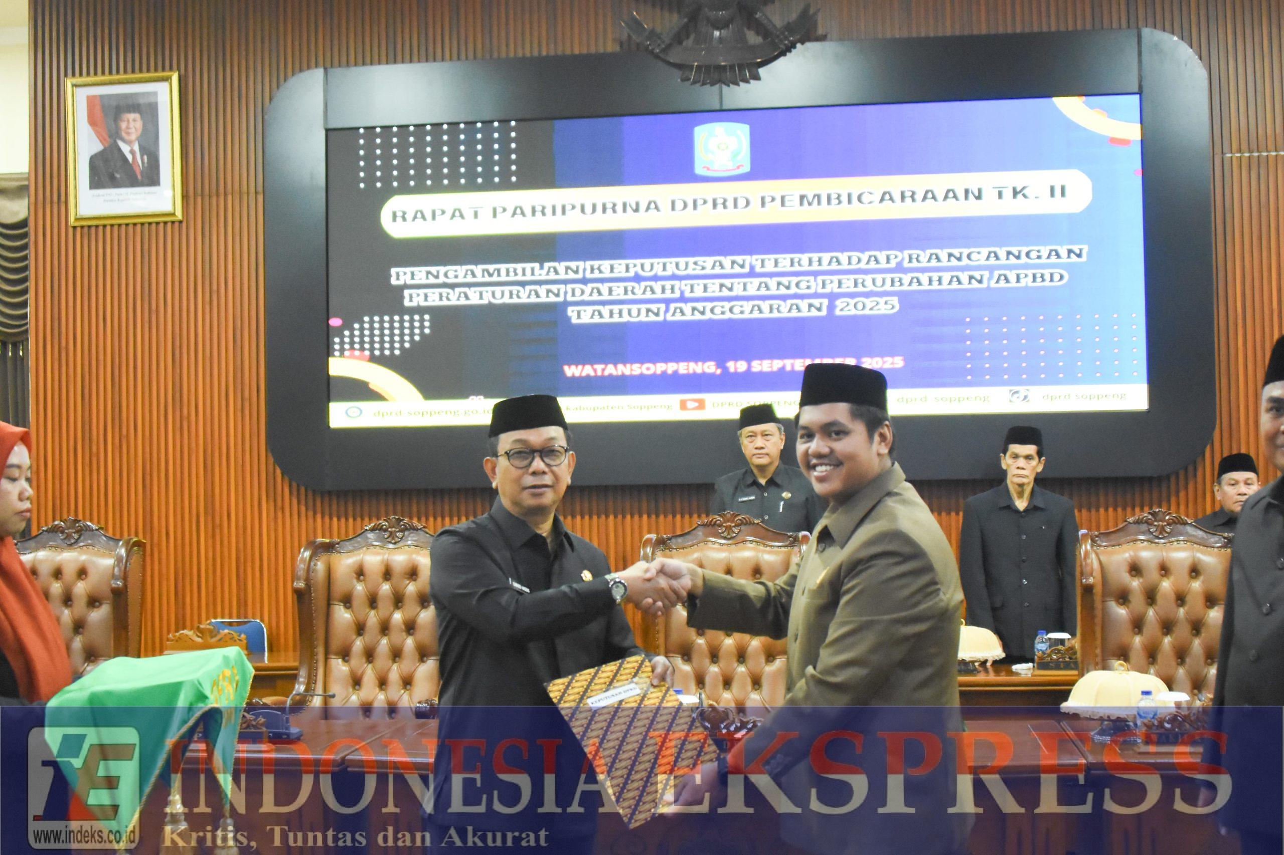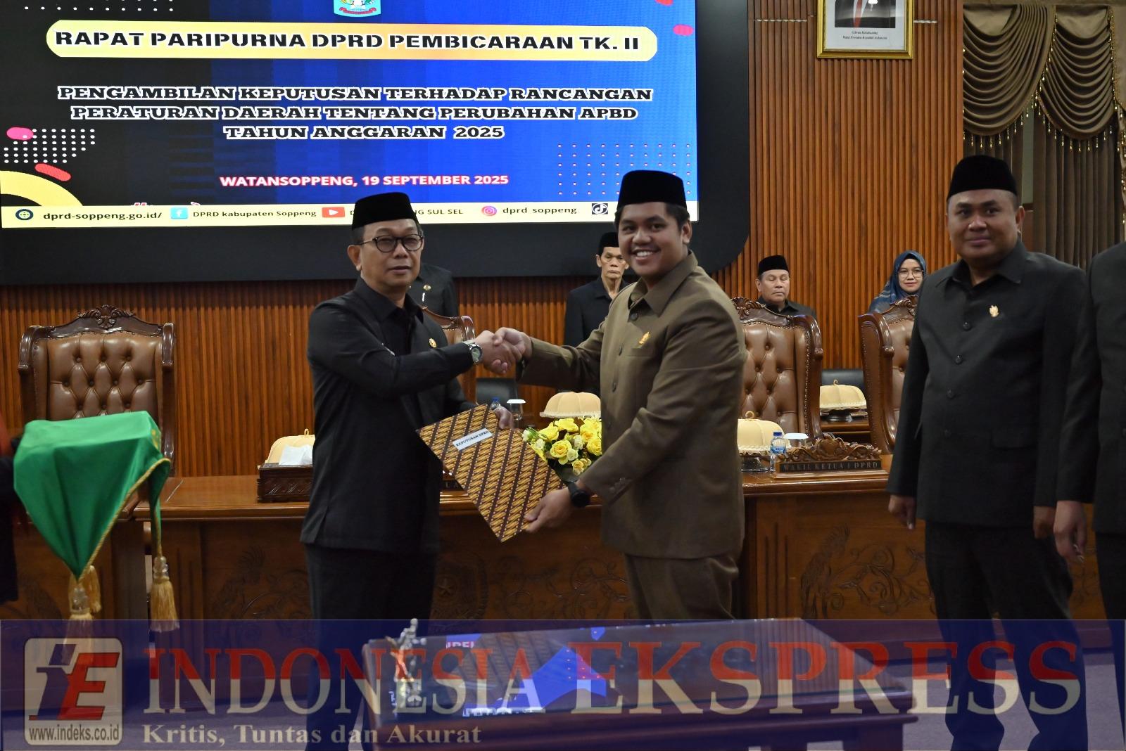 SOPPENG, INDEKS.CO.ID — Bupati Soppeng, H. Suwardi Haseng, SE, menegaskan pentingnya transparansi, akuntabilitas, serta responsivitas dalam pengelolaan anggaran daerah saat menyampaikan sambutan pada Rapat Paripurna DPRD Kabupaten Soppeng Tingkat II dengan agenda pengambilan keputusan terhadap Rancangan Peraturan Daerah tentang Perubahan APBD Tahun Anggaran 2025, di ruang rapat Paripurna DPRD Soppeng, Jumat (19/9/2025).