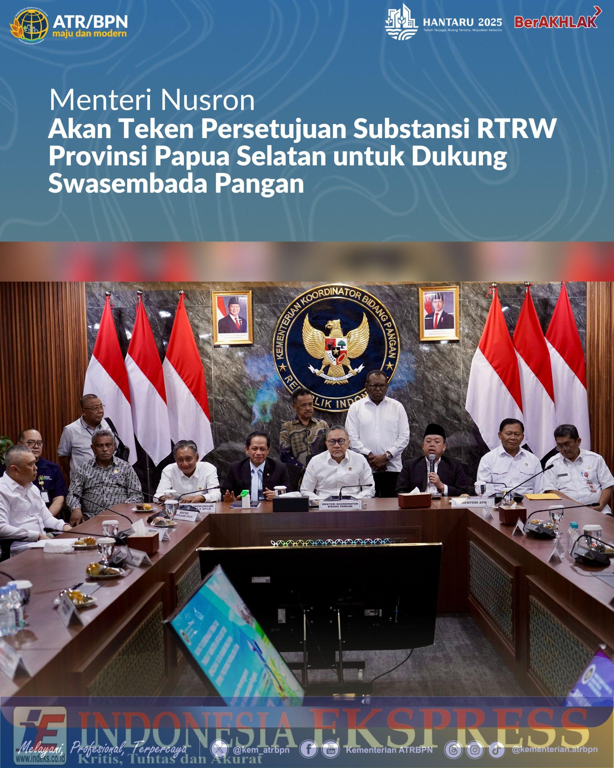 JAKARTA, INDEKS.co.id — Menteri Agraria dan Tata Ruang/Kepala Badan Pertanahan Nasional (ATR/BPN), Nusron Wahid, menekankan pentingnya Rencana Tata Ruang Wilayah (RTRW) sebagai dasar hukum dalam pembangunan daerah, terutama di Provinsi Papua Selatan. Ia menyatakan, akan segera menandatangani Persetujuan Substansi RTRW Provinsi Papua Selatan untuk mendukung program swasembada pangan yang dicanangkan Presiden Republik Indonesia, Prabowo Subianto.