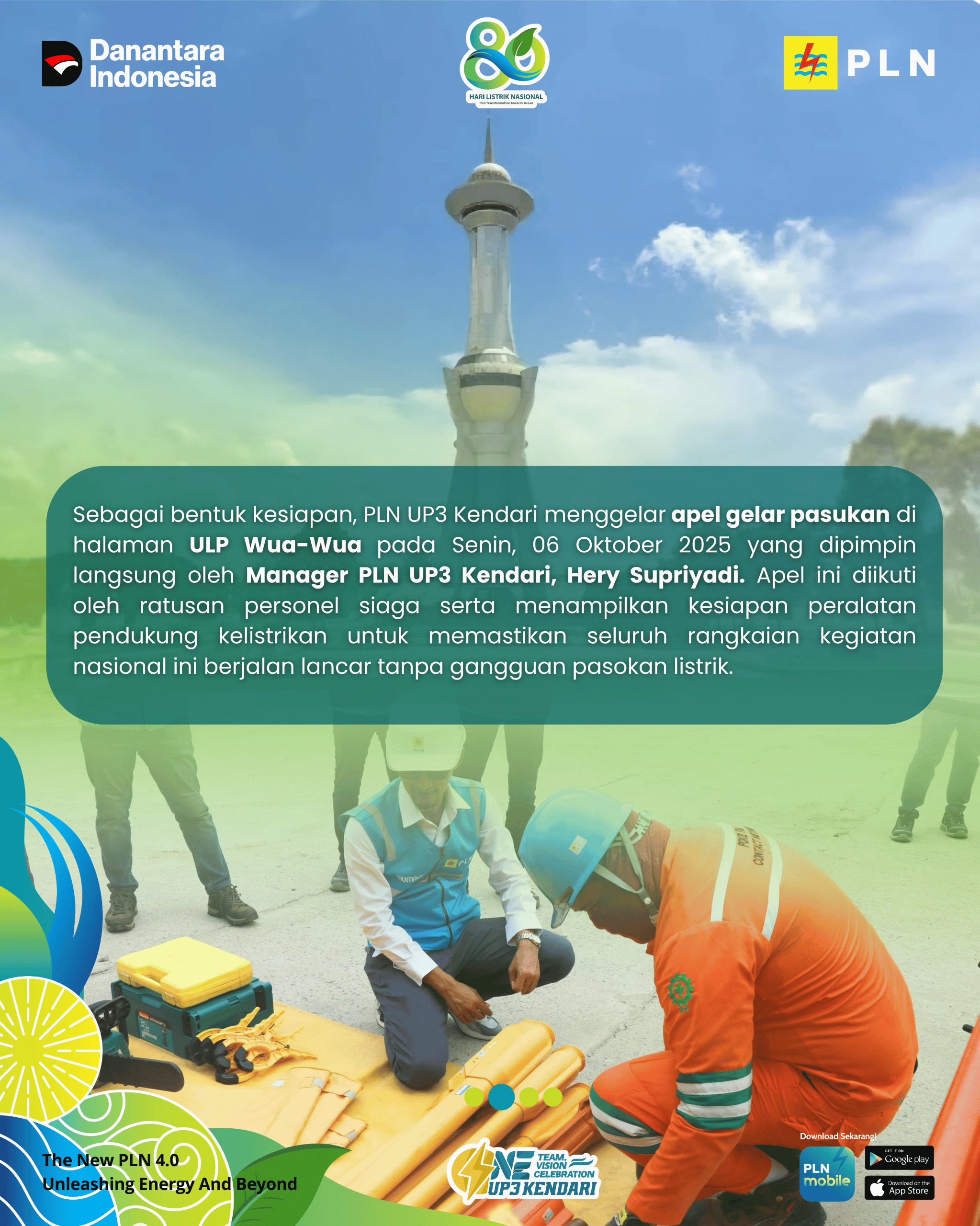 Sebagai bentuk kesiapan, PLN UP3 Kendari menggelar apel gelar pasukan di halaman ULP Wua-Wua yang dipimpin langsung oleh Manager PLN UP3 Kendari, Hery Supriyadi. Apel ini diikuti oleh ratusan personel siaga serta menampilkan kesiapan peralatan pendukung kelistrikan untuk memastikan seluruh rangkaian kegiatan nasional ini berjalan lancar tanpa gangguan pasokan listrik.