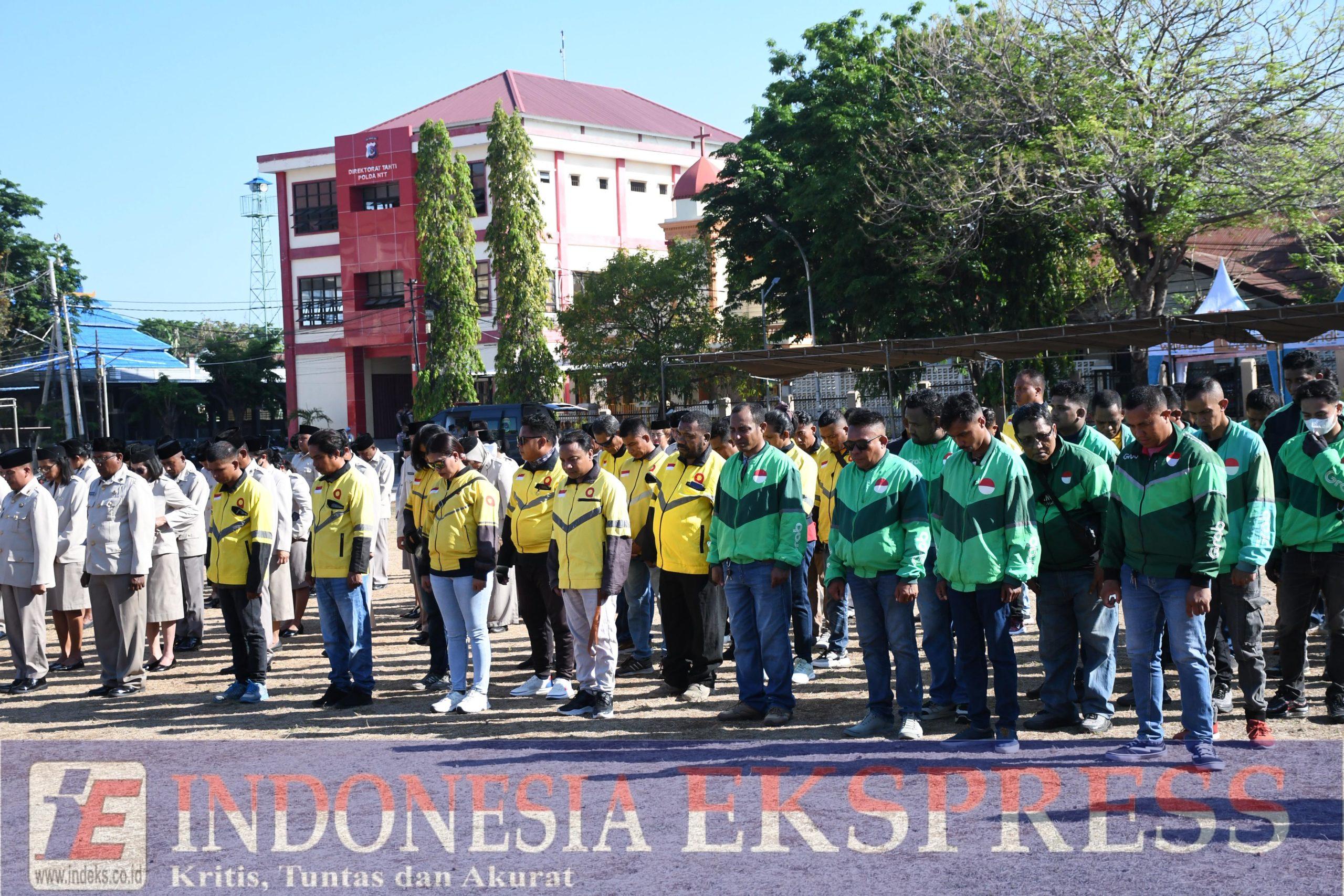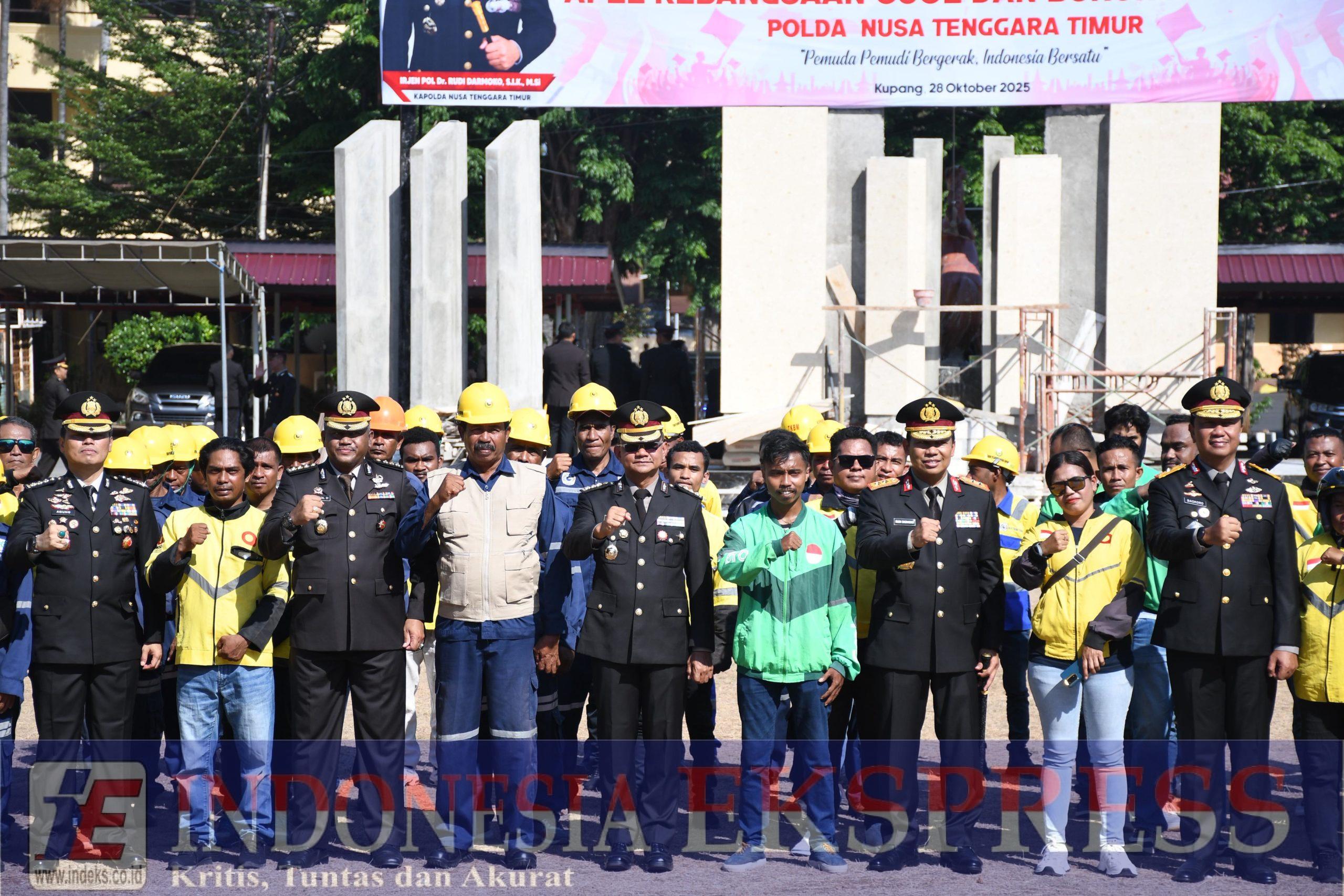 Kupang, Nusa Tenggara Timur, indeks.co.id — Dalam semangat memperkokoh persatuan dan kesatuan bangsa, Kepolisian Daerah Nusa Tenggara Timur (Polda NTT) bersama organisasi Pemuda Pancasila dan Bergerak Indonesia Bersatu menggelar Apel Kebangsaan Ojol dan Buruh di Lapangan Polda NTT, Selasa (28/10/2025). Kegiatan ini diikuti ratusan pengemudi ojek online, buruh, serta elemen masyarakat yang hadir dengan penuh semangat kebangsaan.
