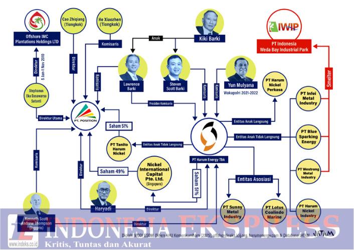 Di puncak hierarki ada Lawrence Barki, Komisaris PT Position sekaligus Presiden Komisaris Harum Energy. Ia adalah pewaris generasi kedua dari konglomerasi keluarga Barki yang membangun kekayaan lewat batu bara di Kalimantan. Kini, Lawrence memindahkan pusat gravitasi bisnis keluarga ke sektor nikel, dari daratan Kalimantan menuju pesisir timur Halmahera.