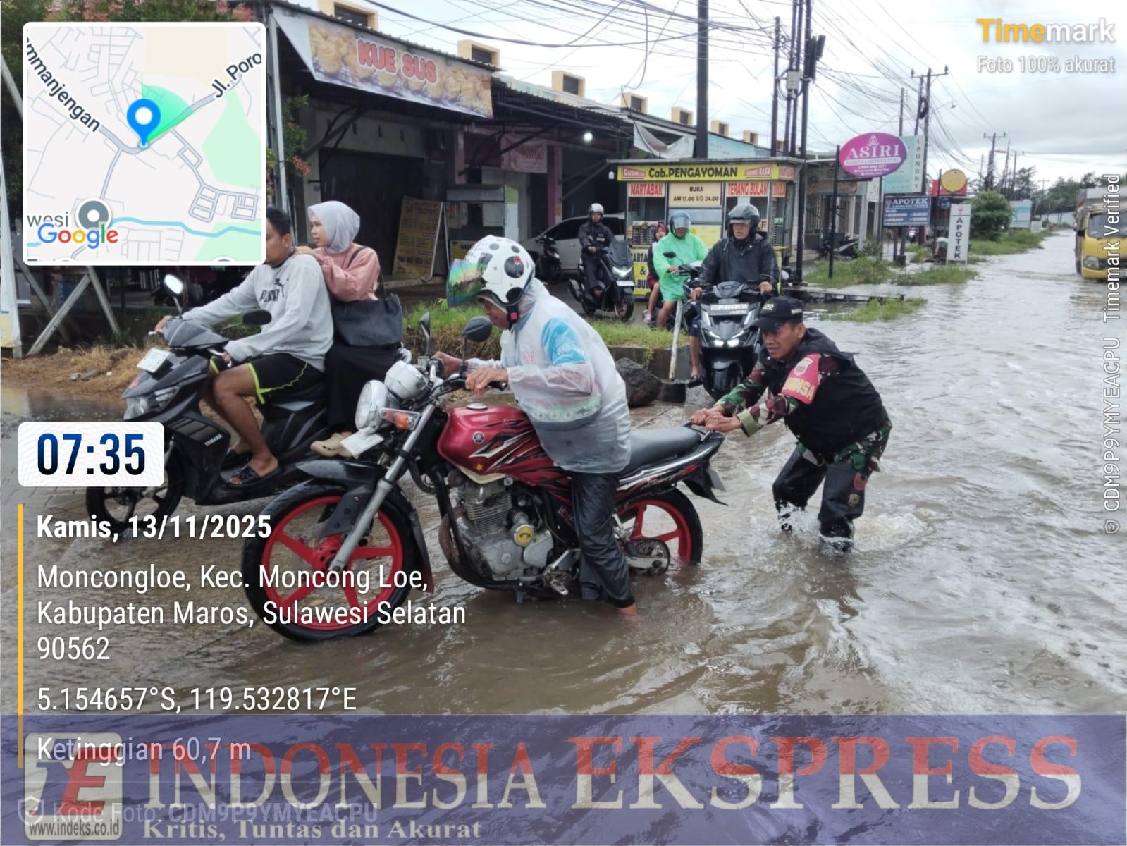Hujan deras yang mengguyur wilayah Kabupaten Maros sejak dini hari menyebabkan sejumlah titik di Kecamatan Moncongloe tergenang air. Salah satu lokasi yang terdampak cukup parah berada di jalan poros Moncongloe–BTP, tepat di samping Kantor Desa Moncongloe.