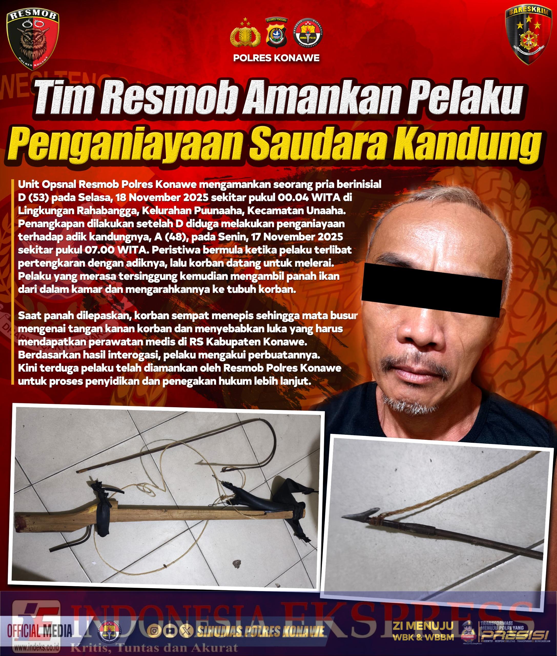 KONAWE, INDEKS.co.id – Tim Resmob Polres Konawe berhasil mengamankan seorang pria berinisial DINI (53) yang diduga kuat melakukan tindak pidana penganiayaan terhadap saudara kandungnya sendiri menggunakan senjata panah ikan. Penangkapan berlangsung pada Selasa, 18 November 2025, sekitar pukul 00.04 Wita di lingkungan Rahabangga, Kelurahan Puunaaha, Kecamatan Unaaha, Kabupaten Konawe.