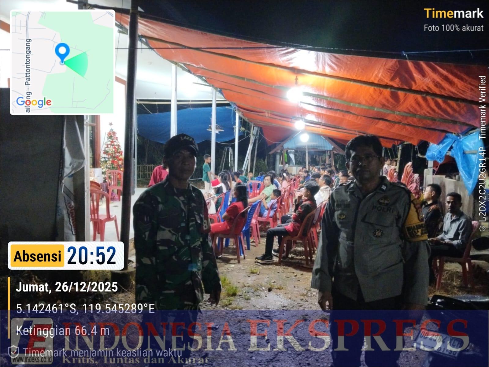 MAROS (INDEKS.CO.ID) — Personel TNI dan Polri bersinergi melaksanakan pengamanan ibadah Natal umat Kristiani di wilayah Kecamatan Moncongloe, Kabupaten Maros, Sulawesi Selatan, Jumat (26/12/2025).