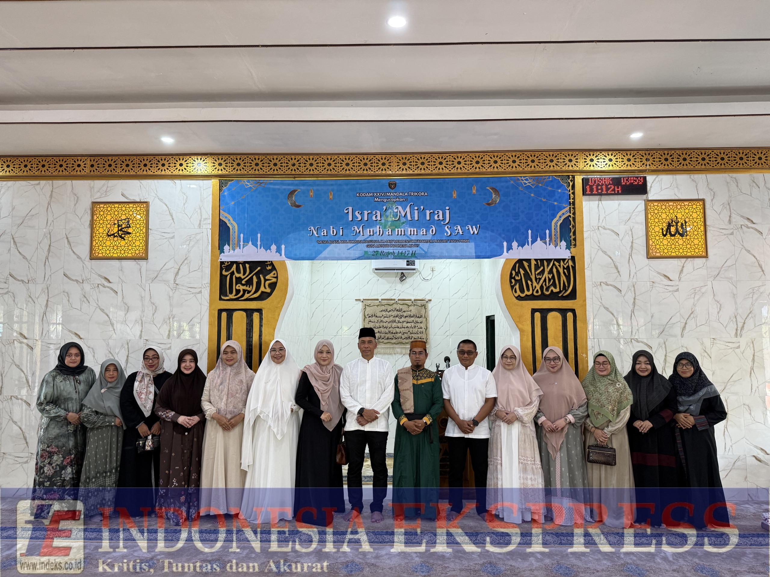 Peringatan Isra Mi’raj Nabi Muhammad SAW kali ini mengusung tema “Meneladani Akhlak Mulia Rasulullah Shallallahu Alaihi Wasallam Guna Membentuk Karakter Prajurit yang Prima Menuju Indonesia Maju” turut hadir dan mendampingi Pangdam XXIV/MT Ny. Dian Lucky Avianto (Ketua Persit KCK Daerah XXIV/MT), Irdam XXIV/MT Brigjen TNI Dwi Endrosasongko, S.Sos., M.I.P., para Asisten Kasdam, para Dan/Kabalakdam XXIV/MT, Danbrigif 83/Bugodi, prajurit, serta pengurus dan anggota Persit KCK Daerah XXIV/MT.