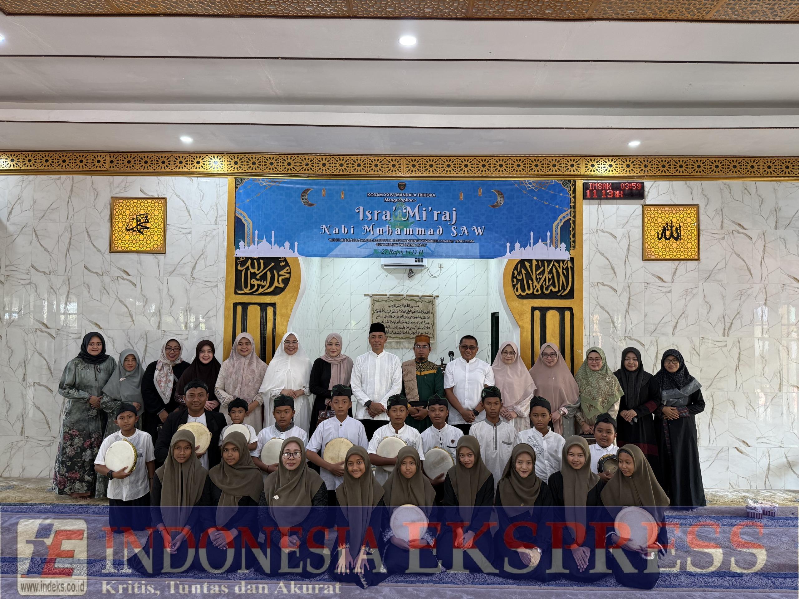 Merauke, INDEKS.co.id — Panglima Kodam XXIV/Mandala Trikora, Mayjen TNI Lucky Avianto, S.I.P., M.Si., mengajak seluruh prajurit dan keluarga besar Kodam XXIV/MT untuk meneladani akhlak mulia Rasulullah Shallallahu Alaihi Wasallam sebagai landasan membentuk karakter prajurit yang prima guna menyongsong Indonesia Maju. Ajakan tersebut disampaikan Pangdam saat memberikan sambutan dalam Peringatan Isra Mi’raj Nabi Muhammad SAW 27 Rajab 1447 H/2026, yang digelar di Masjid At-Taqwa Makodam XXIV/MT, Merauke. Papua Selatan. Jumat (16/1/2026).