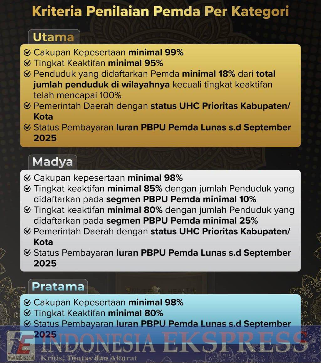 Penghargaan UHC Awards kategori Madya diberikan kepada pemerintah daerah yang memenuhi sejumlah kriteria, antara lain cakupan kepesertaan Jaminan Kesehatan Nasional (JKN) minimal 98 persen dari total penduduk, tingkat keaktifan peserta minimal 85 persen dengan porsi PBI/PBPU Pemda minimal 10 persen dari total penduduk, atau tingkat keaktifan minimal 80 persen dengan porsi PBPU Pemda minimal 25 persen, berstatus UHC Prioritas Kabupaten/Kota, serta status pembayaran iuran PBPU Pemda lunas hingga September 2025.