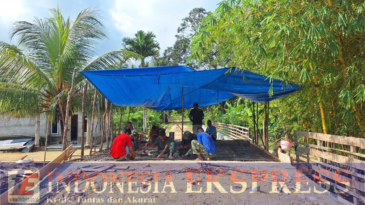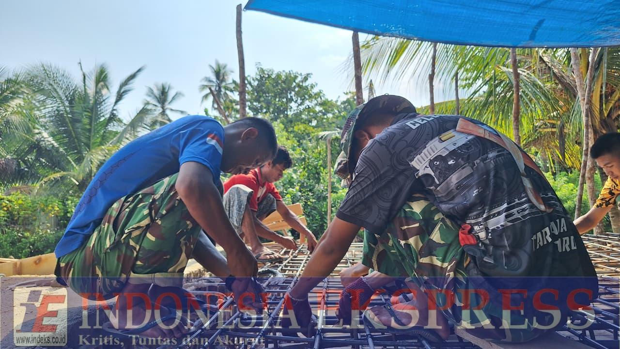 Di bawah terpal yang dipasang untuk melindungi dari terik matahari, personel TNI dan masyarakat setempat bahu-membahu merangkai tulangan besi jembatan dengan penuh ketelitian sebagai bagian dari sasaran fisik program TMMD.