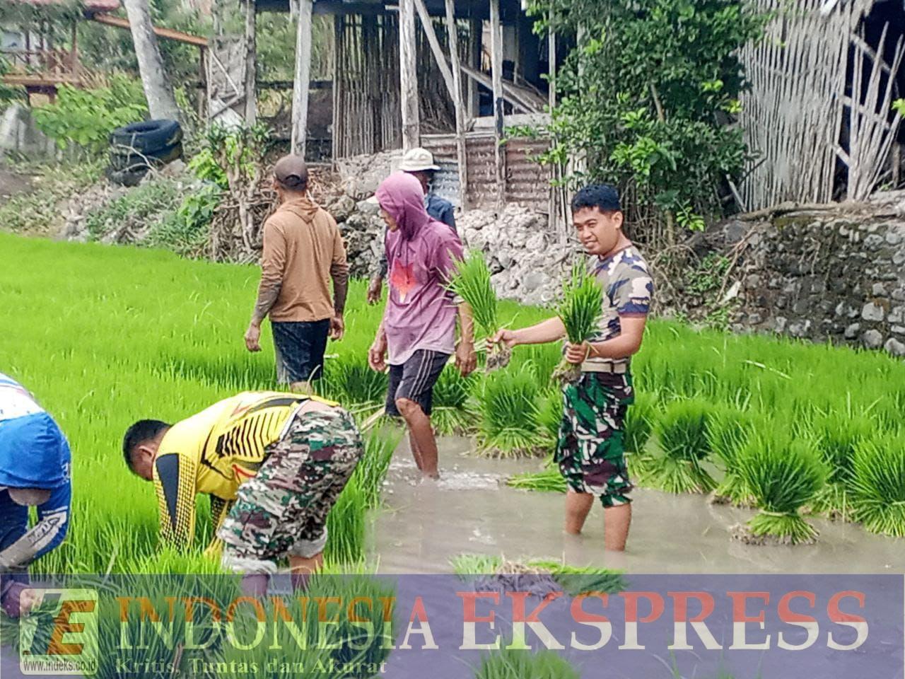 Sejak pagi hari, prajurit TNI dan para petani tampak turun langsung ke sawah untuk menanam padi secara bergotong royong. Meski harus bekerja di tengah genangan air, kegiatan berlangsung dengan penuh semangat dan kebersamaan.