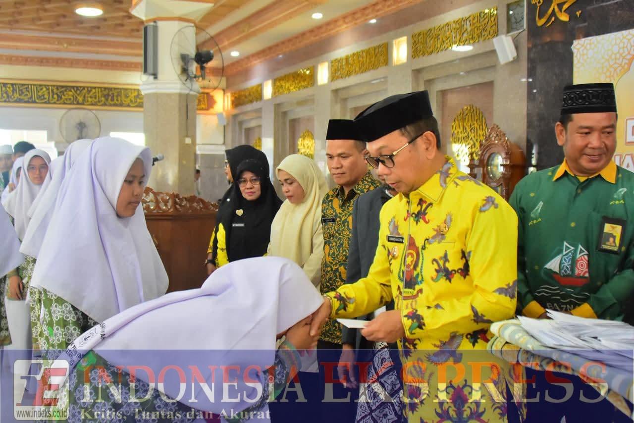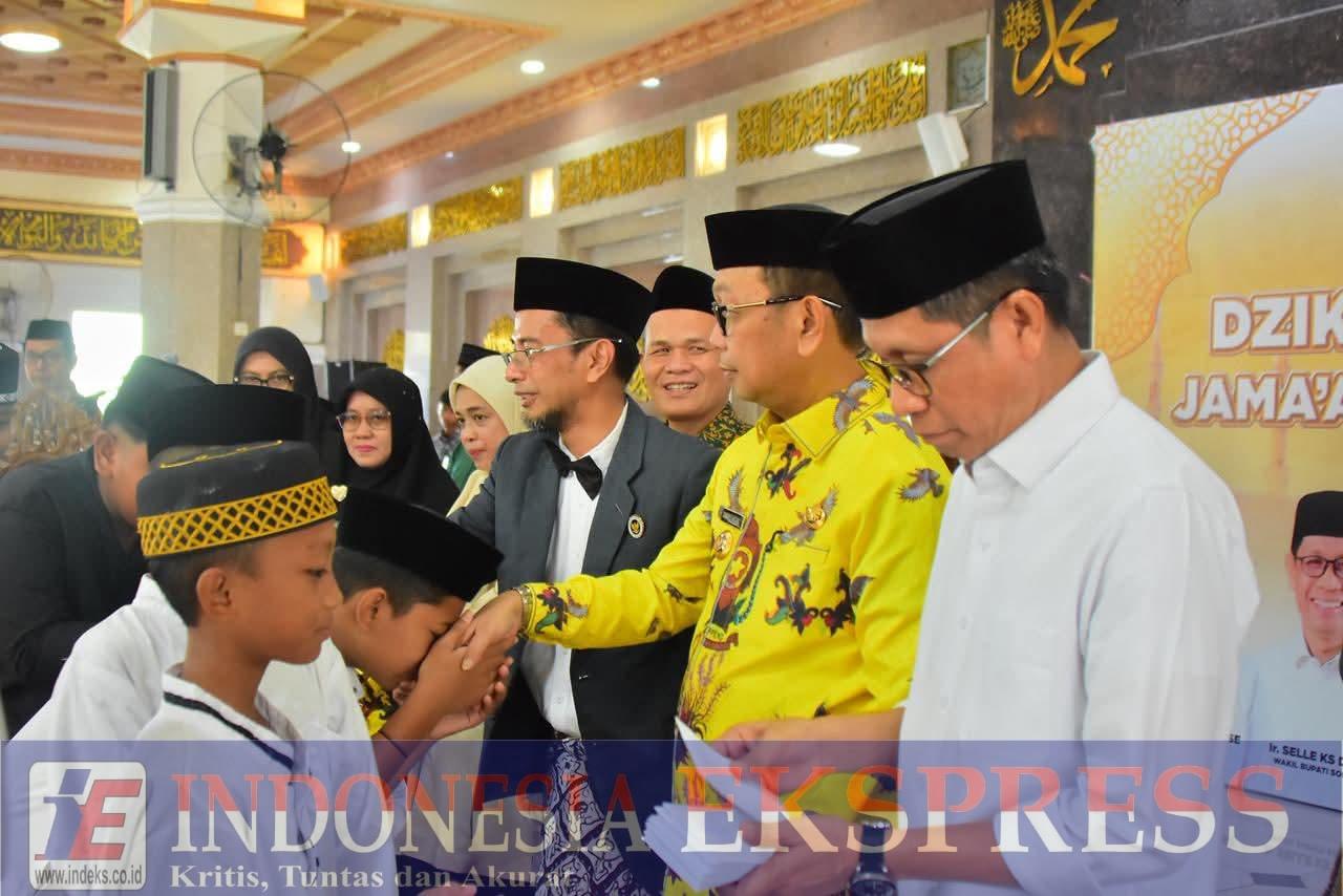 Soppeng (INDEKS) — Bupati Soppeng, H. Suwardi Haseng, bersama Ketua Badan Amil Zakat Nasional (BAZNAS) Kabupaten Soppeng, KM. Satturi, menyerahkan santunan kepada 150 santri dan anak yatim di Masjid Agung Darussalam Watansoppeng, Kamis (16/4/2026).